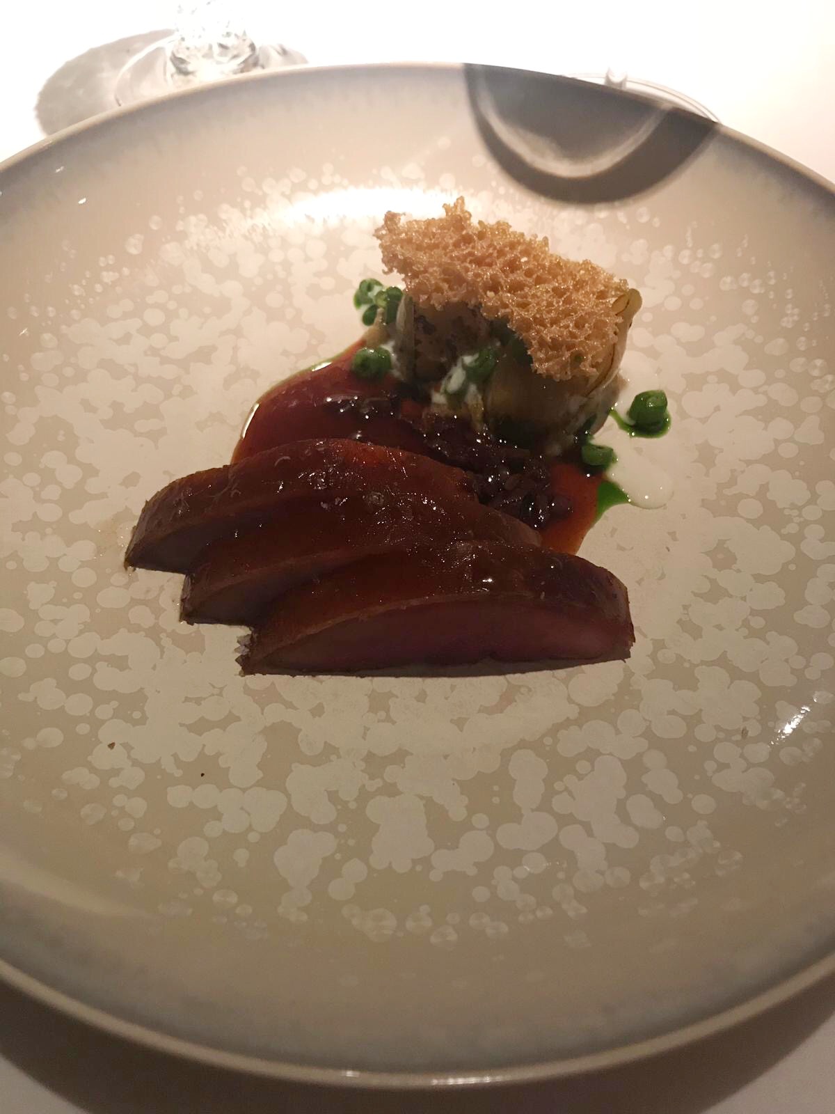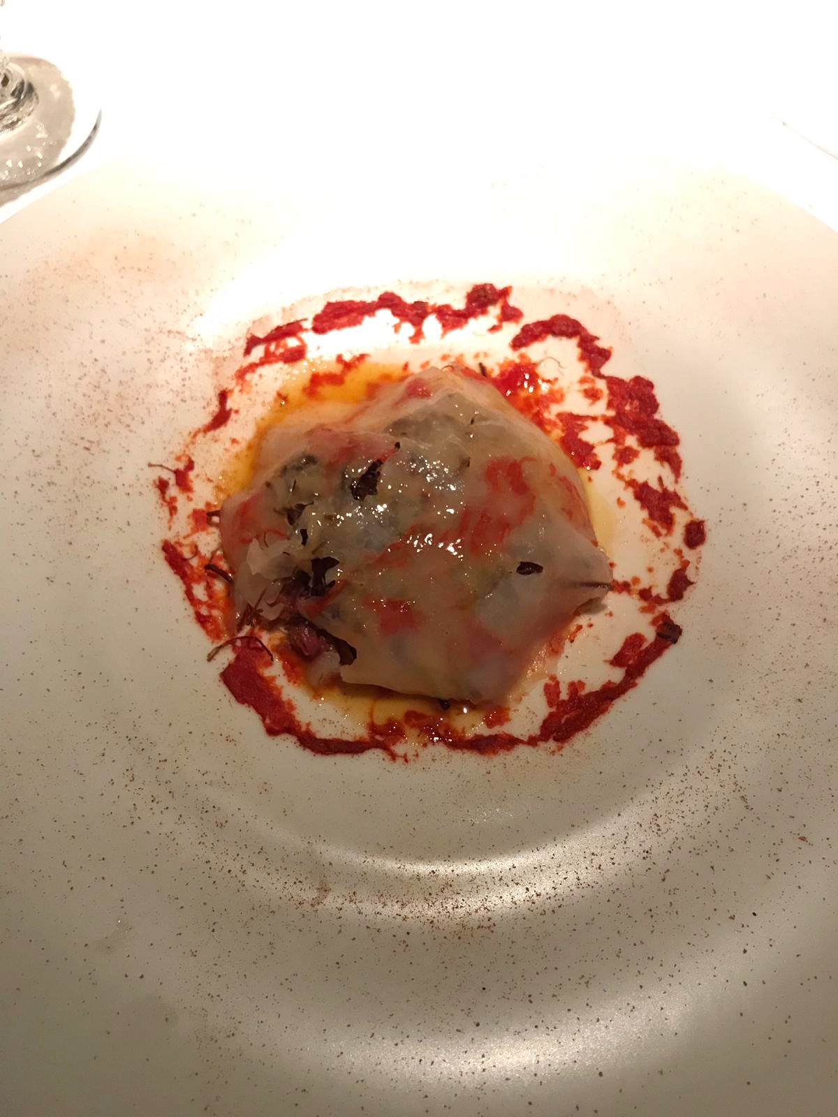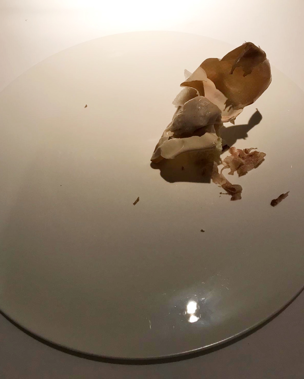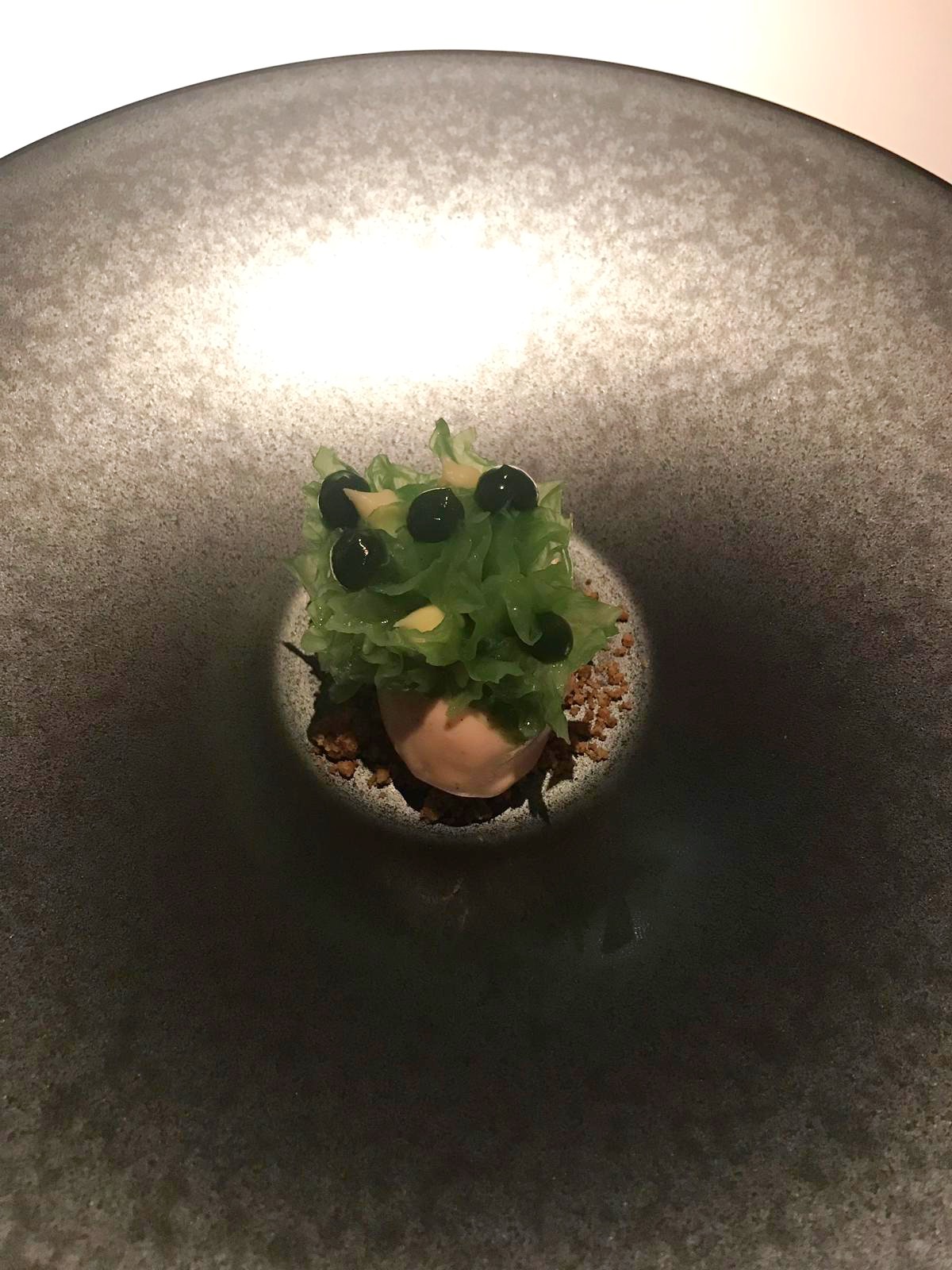 A funny anecdote: at the begin of the evening there was a white-ish thing under a glass cover on the table. We were wondering what it could be: decoration, butter,…? A bit later, someone of the staff came and poured a green substance over it. And a bit later again. Turns out, it was a type of mushroom (tremella) that would be used for our dessert later! A nice touch of mini-entertainment at the table.