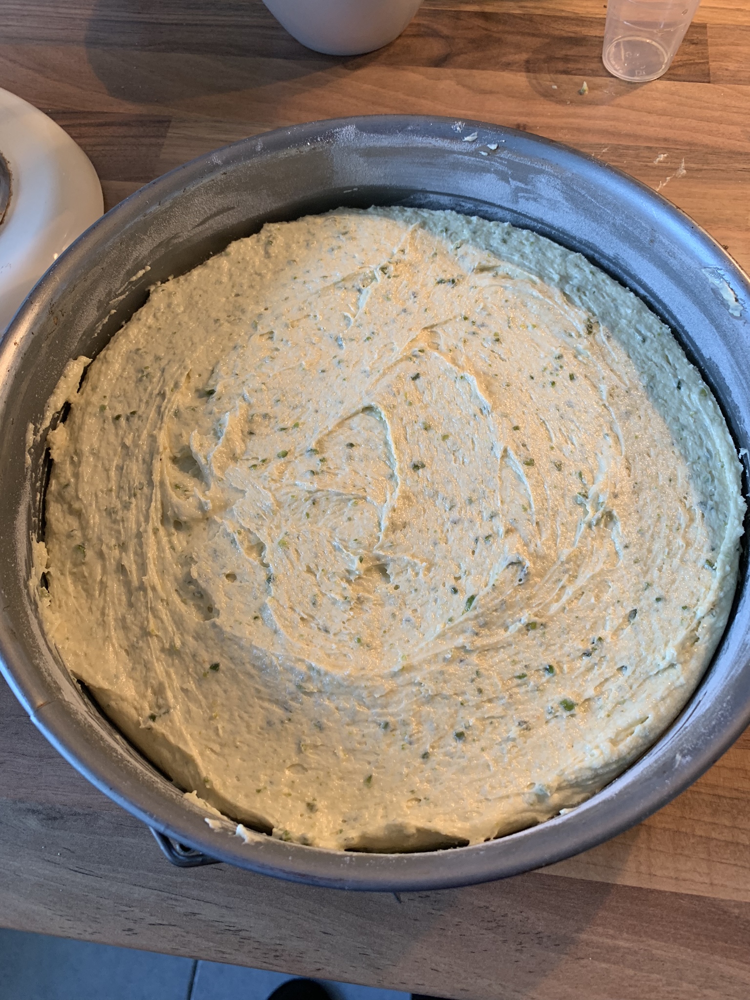 Lastly, add the ricotta and give it a final spin until you end up with a homogeneous mass. Butter and flour the baking mold, and pour the paste in here. Make sure to even out the surface with a spatula. Pop it in the oven for about 50 minutes at 180 degrees Celsius. After that, let it cool down completely. In the meantime, you can make the topping (or use a pre-made one).