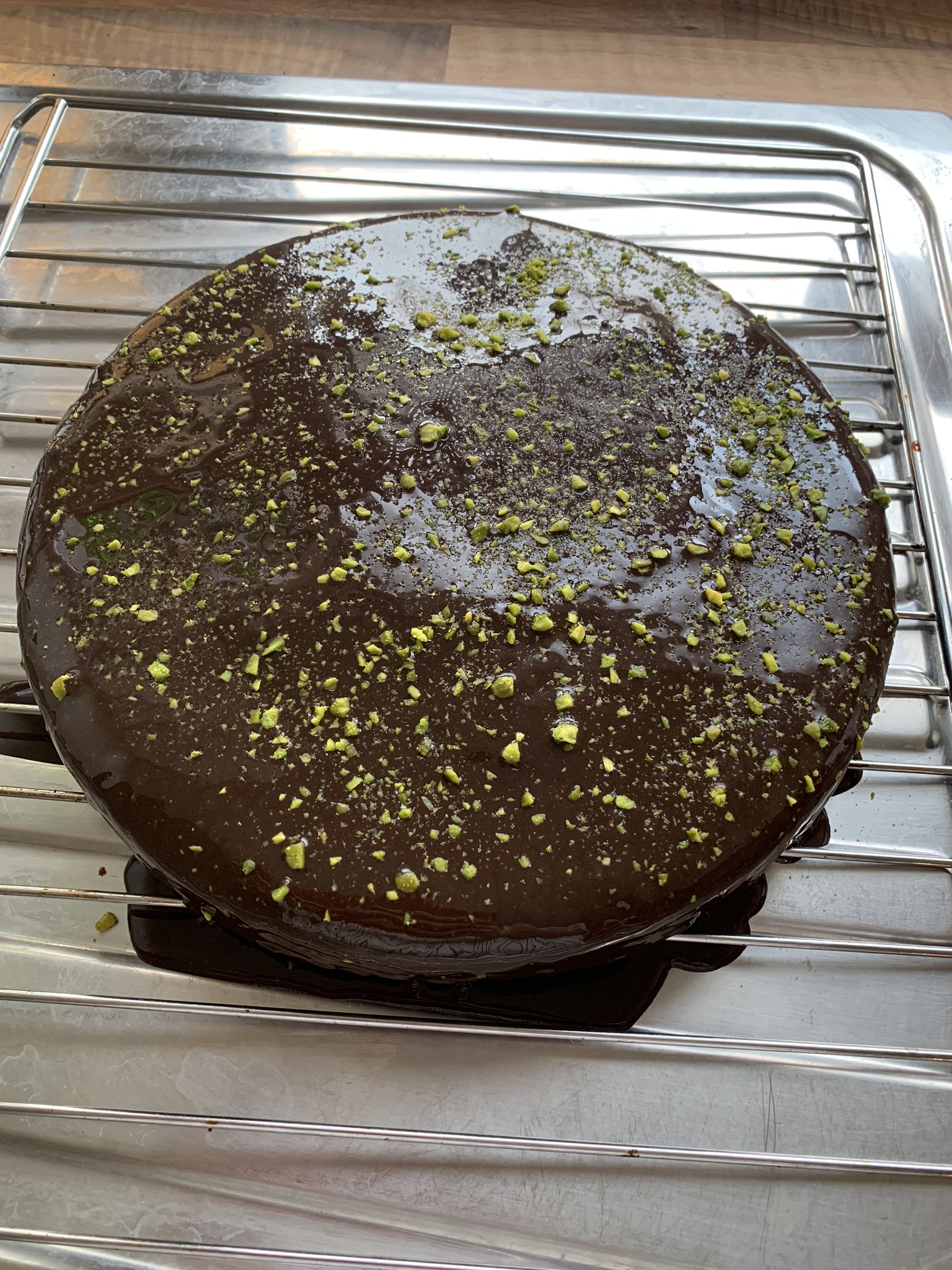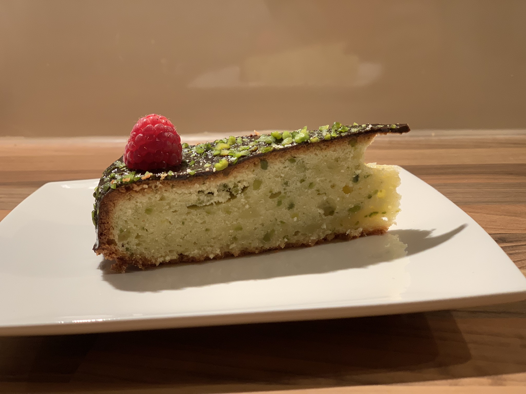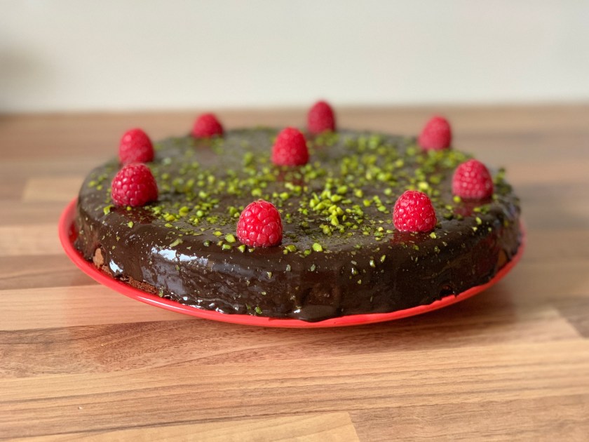 Making the glazing: heat the cream in a pan on the fire until it boils – then pour it over the dark chocolate in a bowl. Mix well with a whisk until you have a nice cream. Add the butter in little pieces until you have a fluid sauce. When the cake is cooled down, pour the glazing on top. Finish with some grated pistacchios (and some raspberries if you want).