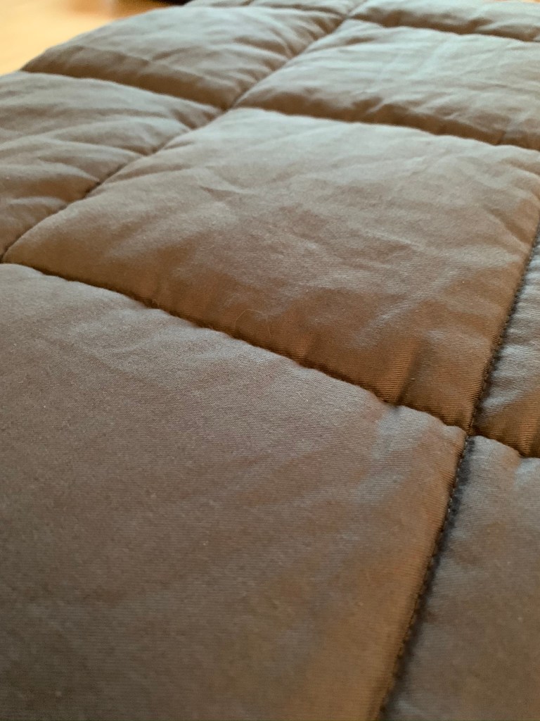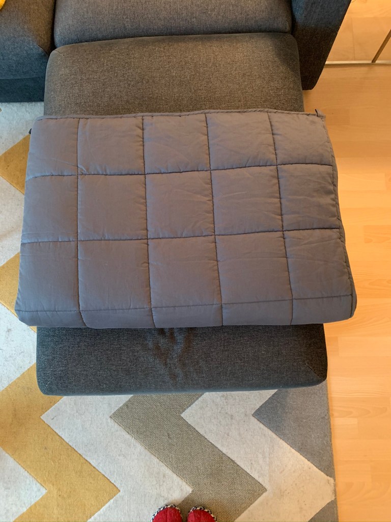 A what? Yep. It’s a blanket filled with tiny glass beads, to make it heavier than usual. It comes in different sizes and weights – mine is 6.8 kg and 150×200 cm. You don’t feel the glass beads at all, they are covered in some layers of microfiber and non-toxic, odorless, BPA and lead free.
