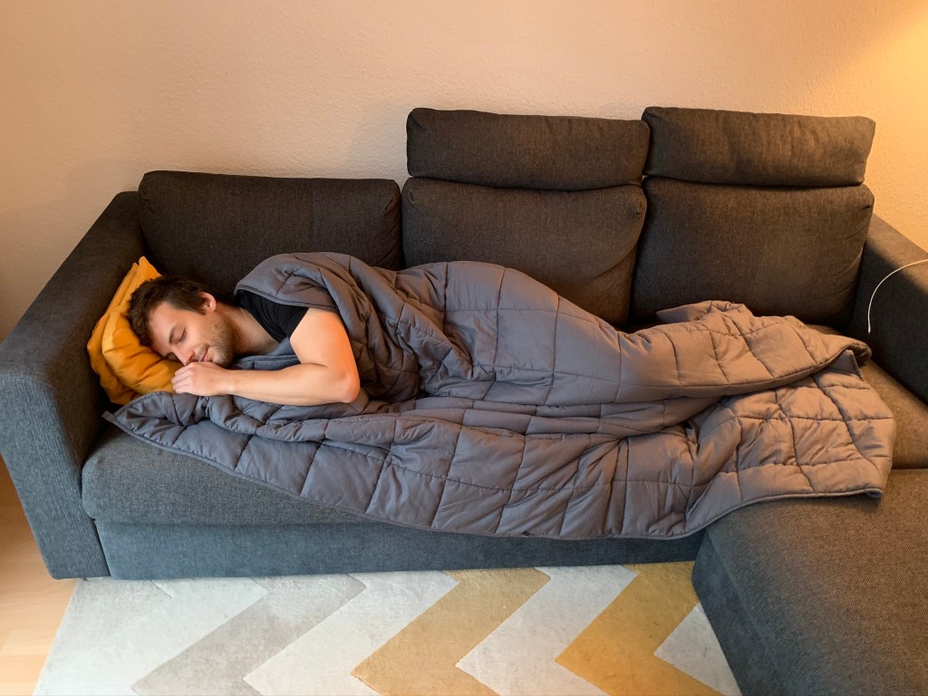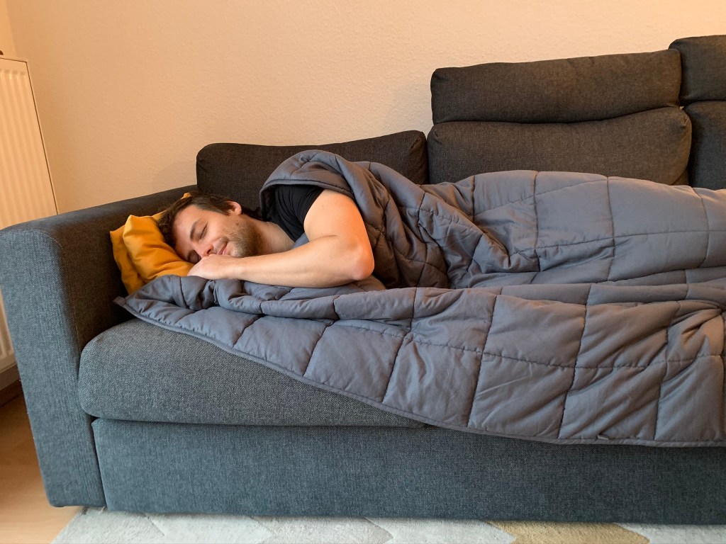 We tried it on our bed, but it was still too warm at night here (10ºC) in Hamburg to use it (it’s definitely not a summer blanket!). But we have both tested it for napping after heavy Christmas lunches, and it really gives a nice, relaxing feeling!