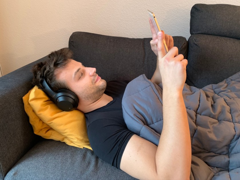 A what? Yep. It’s a blanket filled with tiny glass beads, to make it heavier than usual. It comes in different sizes and weights – mine is 6.8 kg and 150×200 cm. You don’t feel the glass beads at all, they are covered in some layers of microfiber and non-toxic, odorless, BPA and lead free.