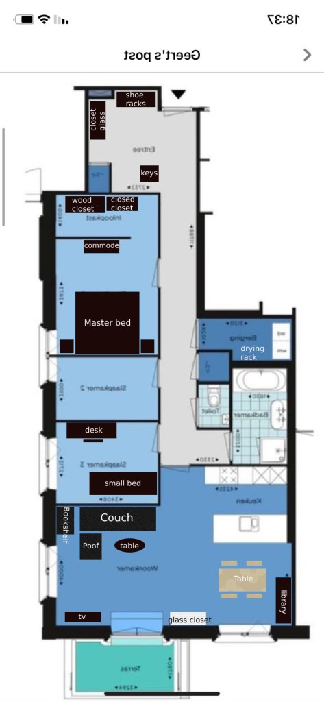 We didn’t buy it – it’s a rental apartment. But I am sooo in love already! The only downside is that it doesn’t have a garden. It has 3 bedrooms, an open kitchen, storage room, bathroom with bathtub and shower, and a south-faced terrace with water view! I only have pictures from the current tenants, but I will share ours as soon as we have settled in! Here’s the floor plan to give you an idea: