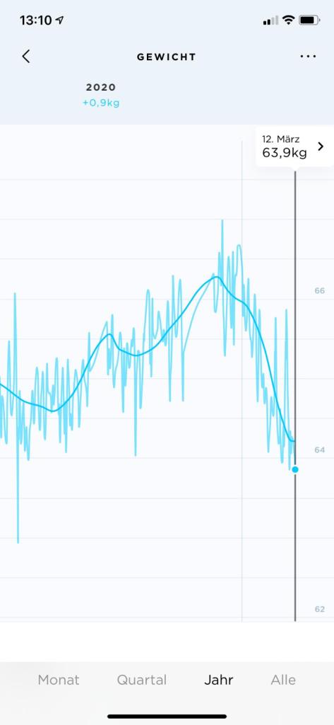 So point 3 is actually still true, but we changed the frequency. We now do 3 HIIT trainings of 30 mins per week, and on the other days still do 10 min of exercises (abs, yoga, whatever). The HIIT is a killer, I can tell you, but I feel soooo good afterwards. And the real motivation is to see the impact on my body (physically and mentally). We discovered this girl (Anna) on Youtube with her channel called Growingannanas and she has been our fitness coach for the last months. Ok, here’s the results of this year so far – the spikes are the daily measures and the line is the average: