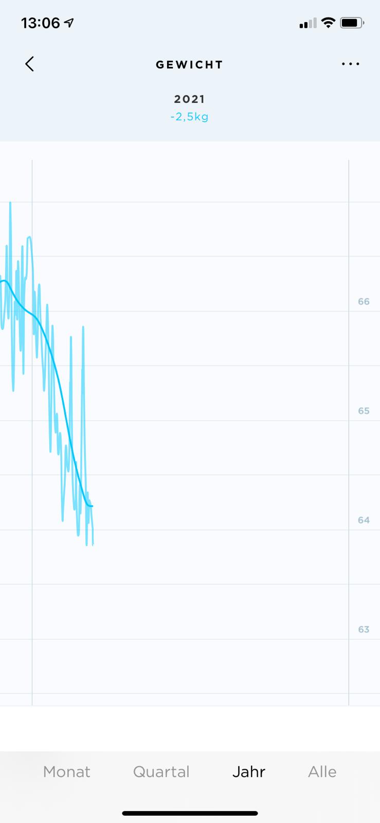 As you can see, my daily weight fluctuates quite a lot but the general trend is like in freefall! Super motivating to see this. Here’s a bit a longer trend. The light grey line marks the beginning of 2021, and the start of our HIIT trainings: