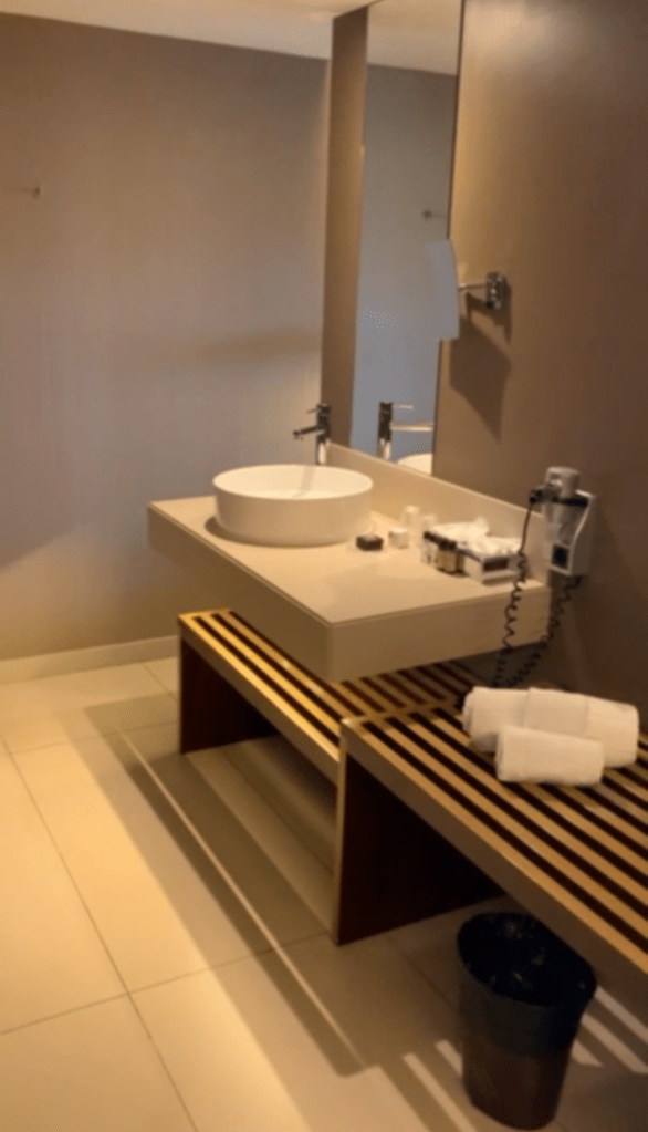The room was quite nice, you walked in and had closets on the right, and on the left your sink separate from the shower (handy so you can do your make-up while the husband already showers ;-)). Also the toilet was separate. I forgot to take pictures, so here’s screenshots out of a video I took: